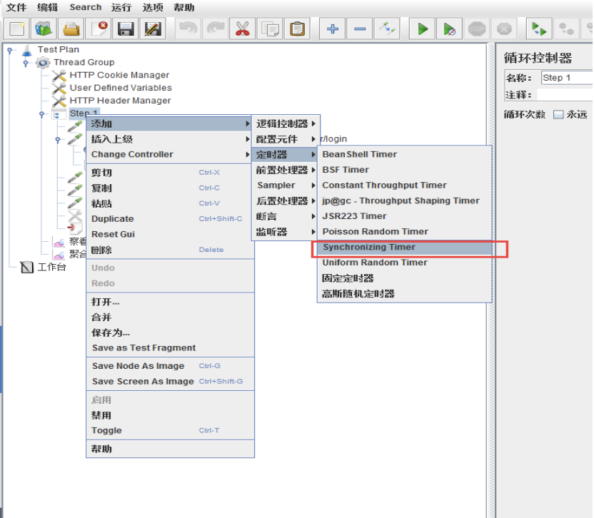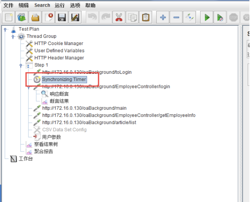 2.将Synchronizing Timer拖动到要定时集合的上面(例如:并发登陆,就放在登陆的上面,不是里面)