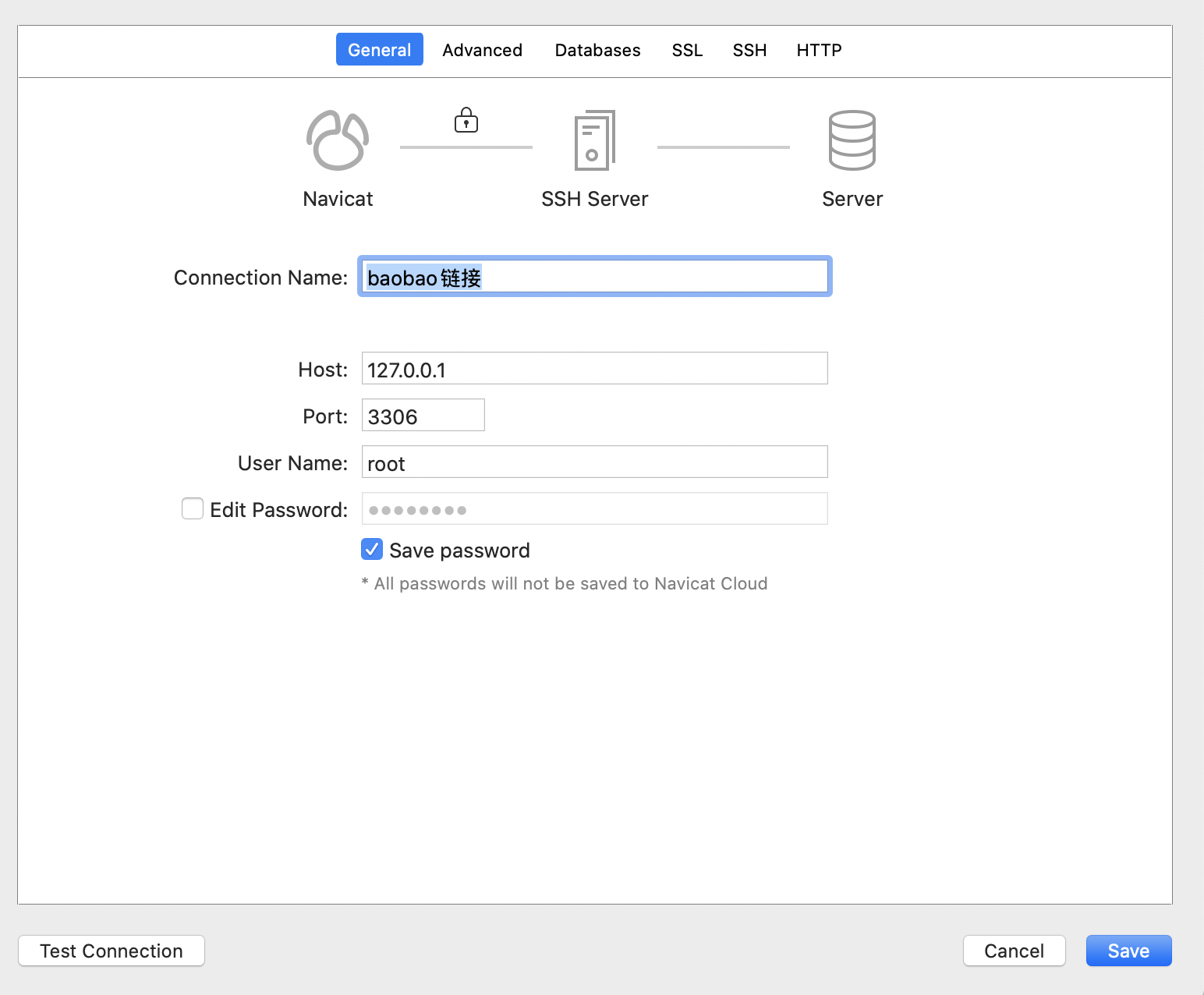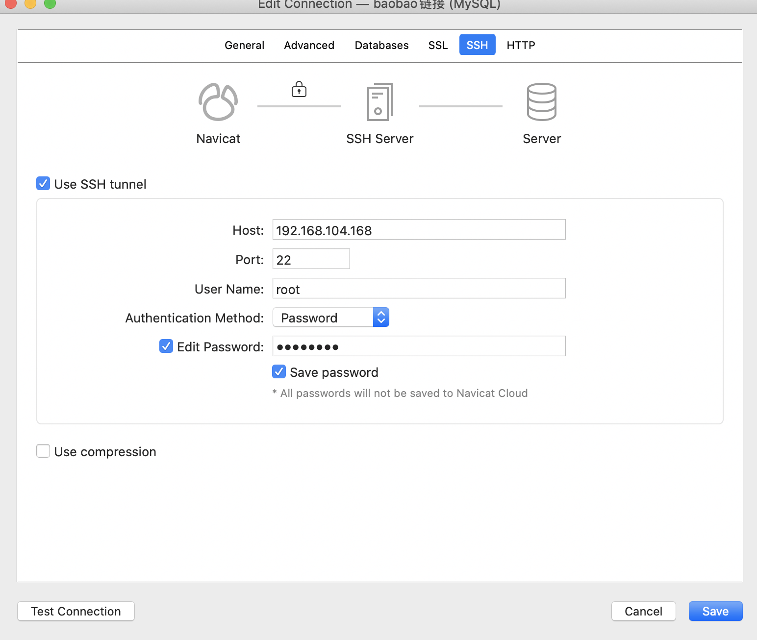 1、使用navicat--ssh链接虚拟机,输入linux-ip,linux用户名/密码;