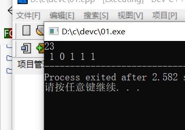#include<stdio.h> int main(){ int arr[32]={0}; int a,i,t=0; scanf("%d",&a); for(i=0;i<=t;i++){ if(a!=0){ arr[i]=a%2; a=a/2; t++; } } for(i=0;i<t/2;i++){ //printf("%2d",arr[i]); int te=arr[i]; arr[i]=arr[t-1-i]; arr[t-1-i]=te; } for(i=0;i<t;i++){ printf("%2d",arr[i]); } return 0; }