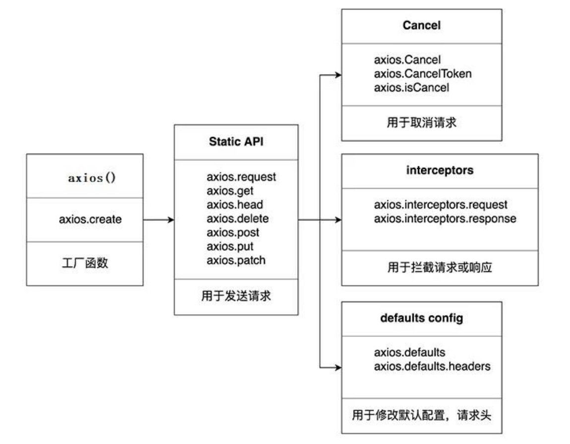 - axios 作为对象有 Axios 原型对象上的所有方法, 有 Axios 对象上所有属性