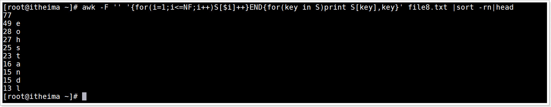 awk -F "" '{for(i=1;i<=NF;i++)S[$i]++}END{for(key in S)print S[key],key}' file8.txt |sort -rn|head