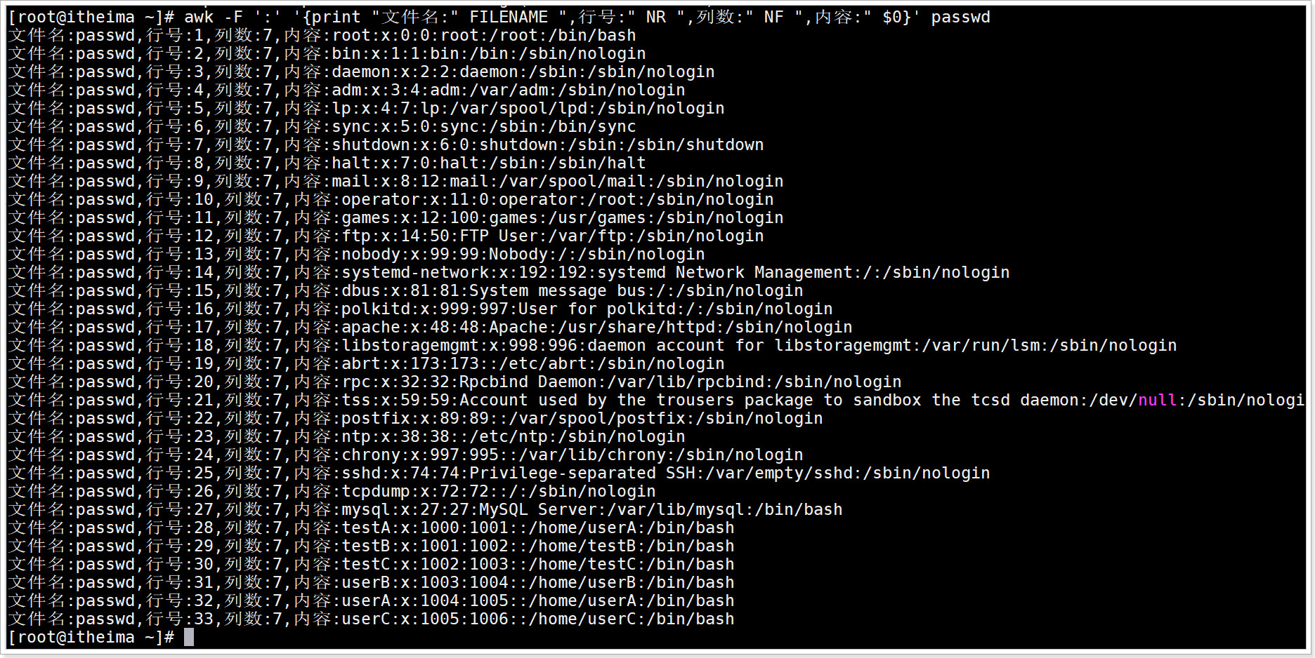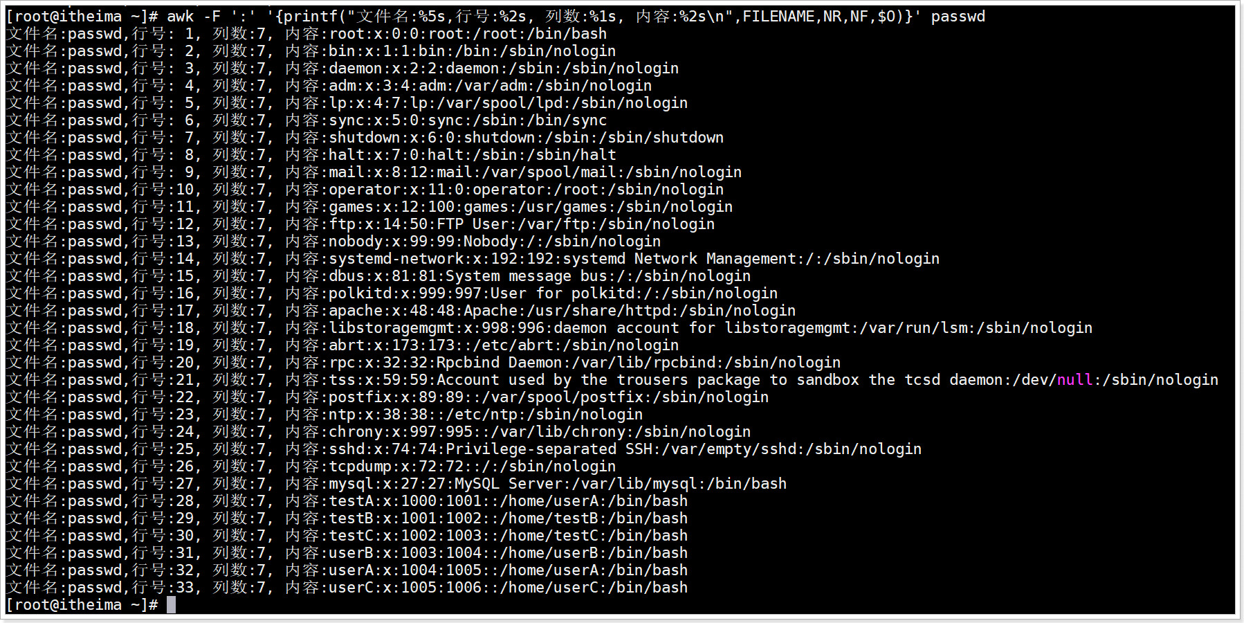 | /sbin/nologin | 未登录解析器, shell设置为/sbin/nologin 是用于控制用户禁止登陆系统的, 有时候有些服务,比如邮件服务,大部分都是用来接收主机的邮件而已,并不需要登陆 |