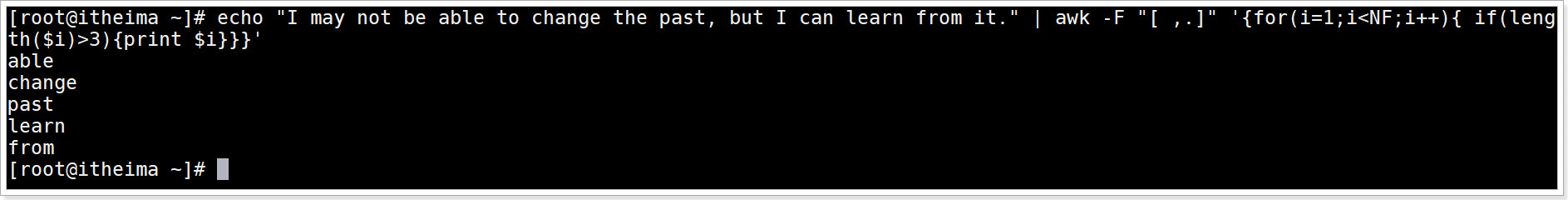 echo "I may not be able to change the past, but I can learn from it." | awk -F "[ ,.]" '{for(i=1;i<NF;i++){ if(length($i)>3){print $i}}}'