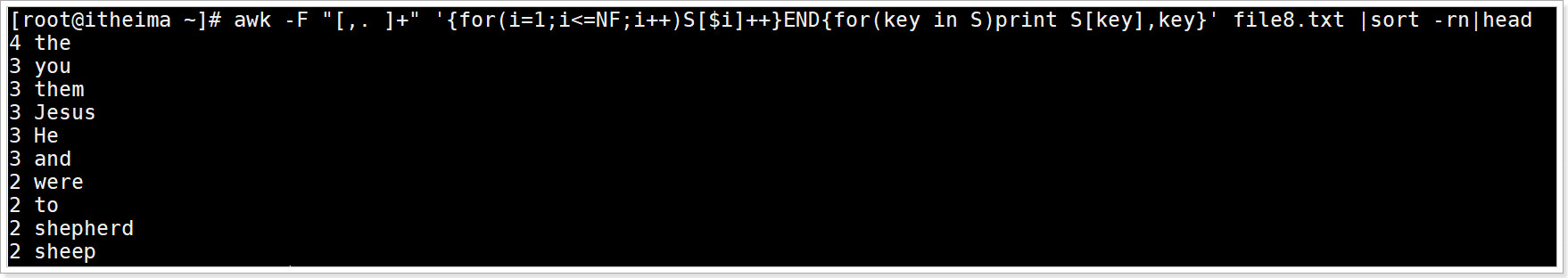 awk -F "[,. ]+" '{for(i=1;i<=NF;i++)S[$i]++}END{for(key in S)print S[key],key}' file8.txt |sort -rn|head