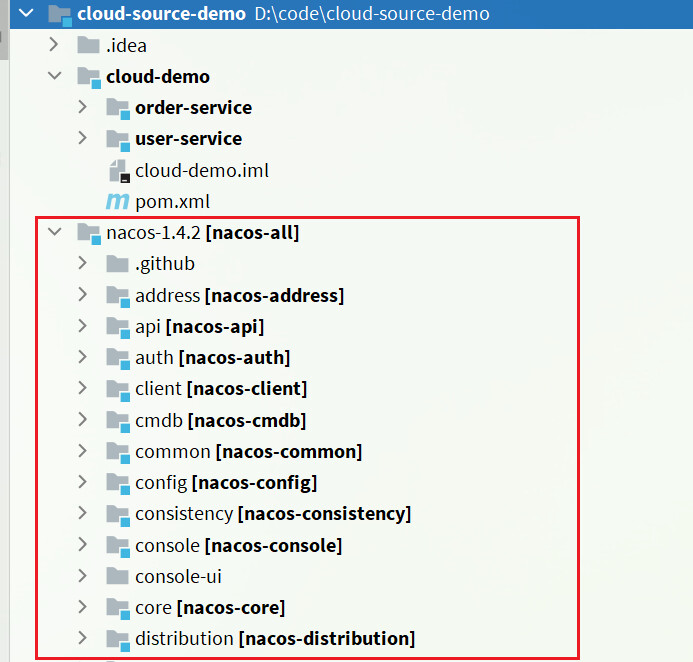 将之前下载好的Nacos源码解压到cloud-source-demo项目目录中: