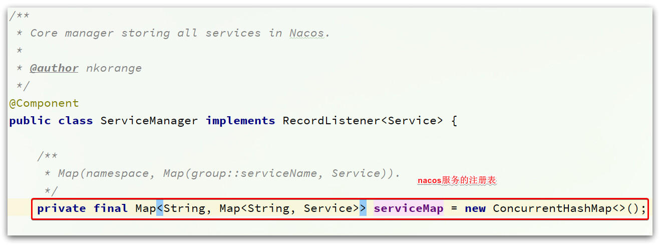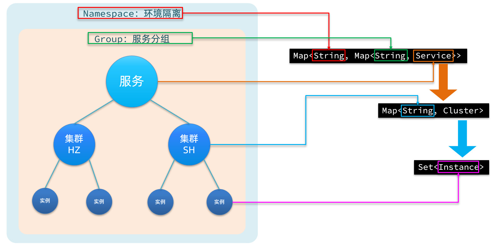 每一个服务去注册到Nacos时,就会把信息组织并存入这个Map中。