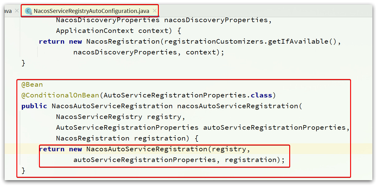 可以看到,在NacosServiceRegistryAutoConfiguration这个类中,包含一个跟自动注册有关的Bean: