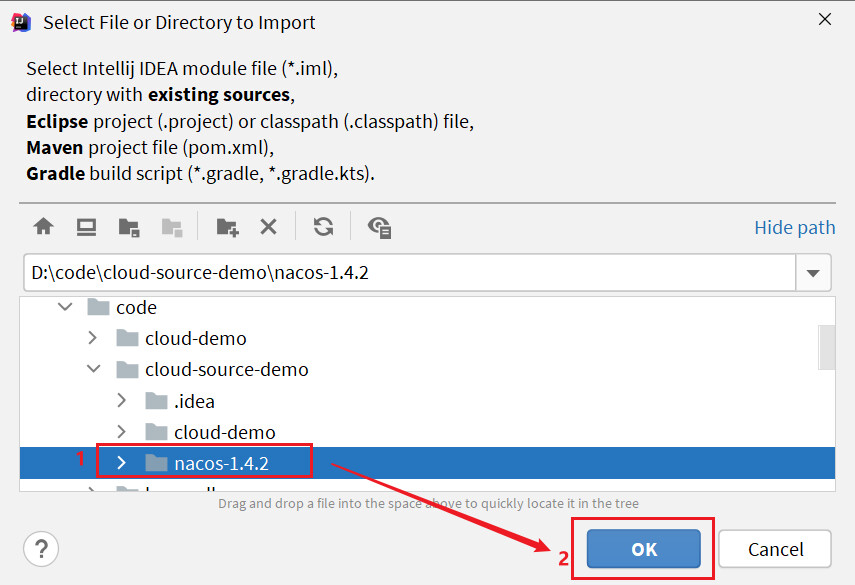在弹出窗口中,选择nacos源码目录: