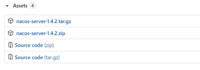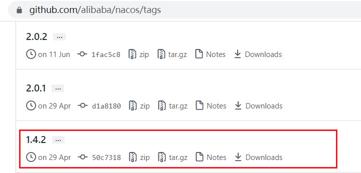 大家找到其release页面:https://github.com/alibaba/nacos/tags,找到其中的1.4.2.版本: