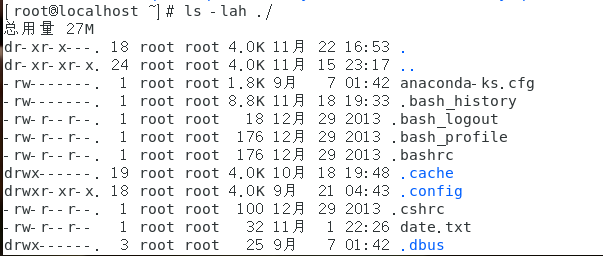 语法3:ls -lah 路径 //以特定格式列出指定目录下的所有文件和文件夹的名称,-l表示以详细列表的形式显示,-a表示显示所有文件和文件夹(包括隐藏的文件和文件夹,隐藏文档名称以” . ”开头,-h表示显示文档大小时以可读性较高的形式显示,三个选项可组合或单独使用)