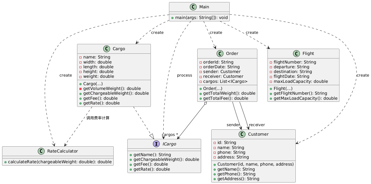 ICargo接口定义了货物的核心行为(如getChargeableWeight),使得Cargo类能够通过实现接口保证功能的一致性。这种设计允许未来新增其他货物类型(如冷链货物)时,只需实现接口即可,无需修改现有逻辑。