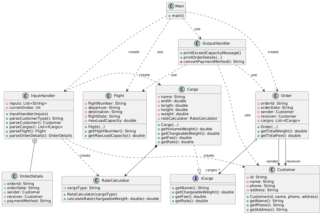 货物模块:读取货物类型(普通/危险/加急)→ 创建对应RateCalculator → 循环解析每个货物的名称、尺寸、重量,构建Cargo列表。