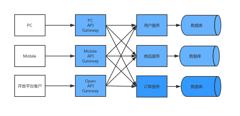 4、在面向不同客户端时,可以增加不同的API网关,而不需要调整微服务;