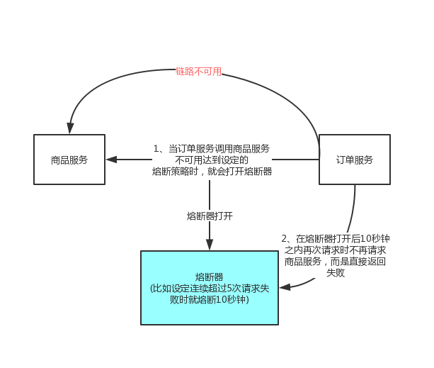 2、熔断器:当请求异常次数达到设定值时打开熔断器,让请求直接返回失败,这样有效提高服务的响应效率也能保证别的服务不受影响,当熔断时间一过自动关闭熔断器让服务恢复正常使用;
