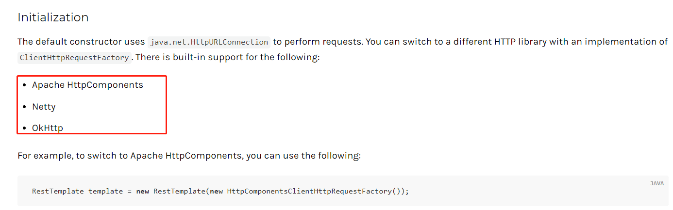 RestTemplate可以支持第三方的ClientHttpRequestFactory,通过Spring官方可以看到支持如下第三方组件