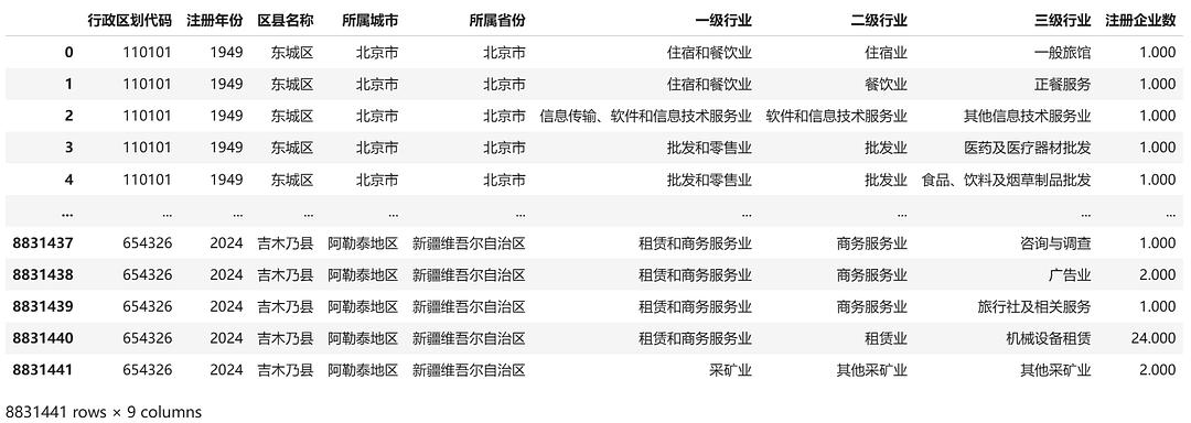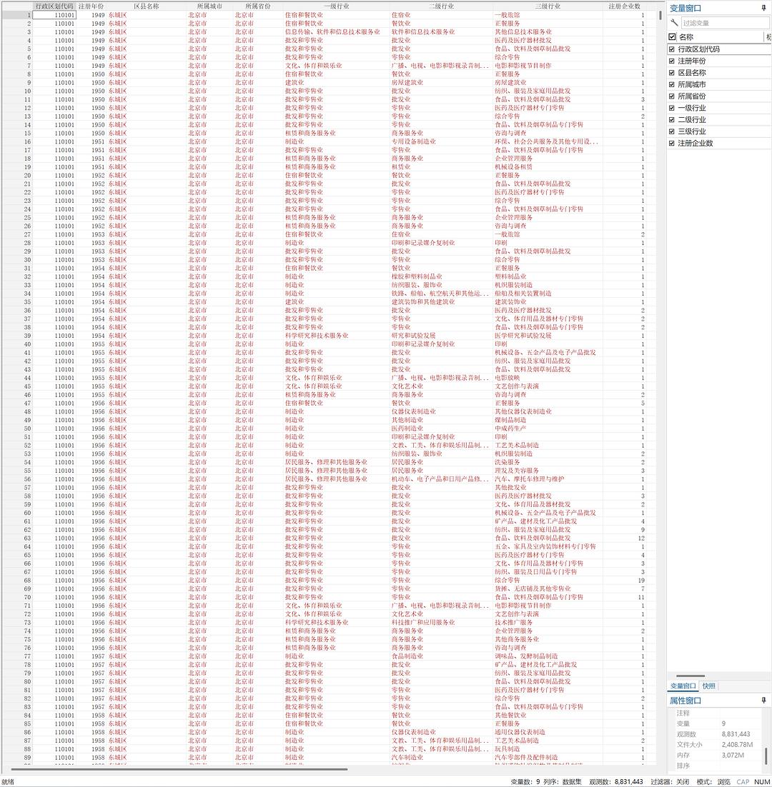 整理的区县数据年份为1949-2024年,样本总量为883万。包括2800+区县的20个行业大类、96个行业中类、432个行业小类统计数据,可为研究中国区县创业提供数据协助