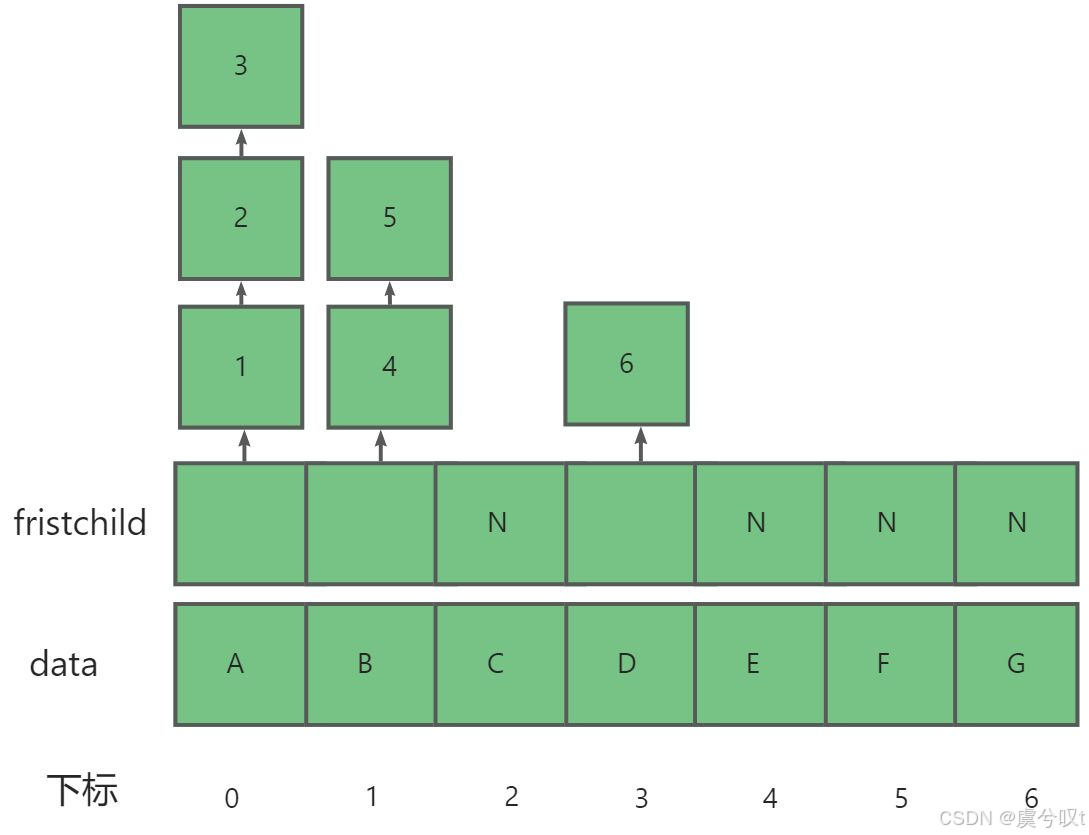 树的孩子表示法就是采用顺序表与链表结合的形式,用顺序表存储树的值与链表的头节点,而链表的头节点存储其孩子节点在顺序表中的下标,若没有则记为空。