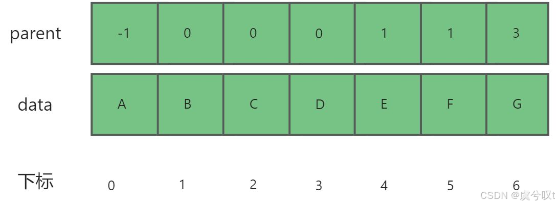 双亲表示法采用顺序表的方式存储,即用顺序表存储各个节点的数据,并且同时存储其双亲节点的下标。注意:根节点没有双亲节点,所以特别记为-1。