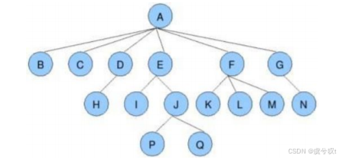 子孙:以某结点为根的子树中任一结点都称为该结点的子孙。 如上图,所有结点都是A的子孙。