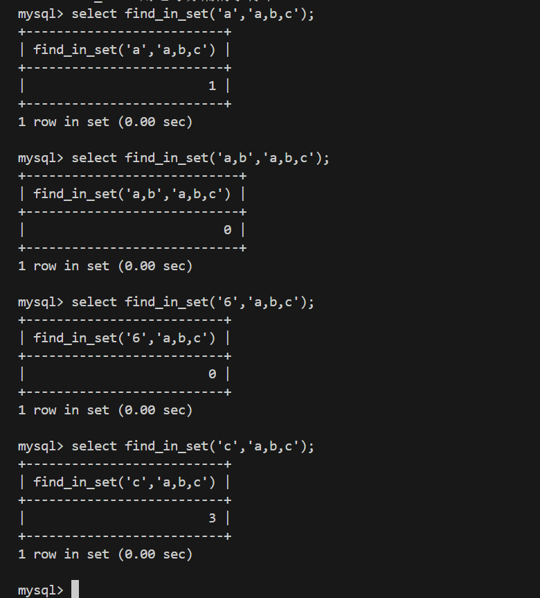 find_in_set(sub,str_list) :如果 sub 在 str_list 中,则返回下标;如果不在,返回0;