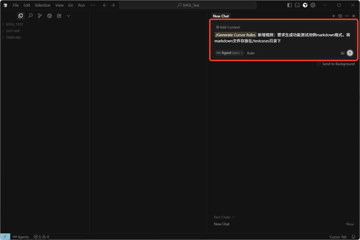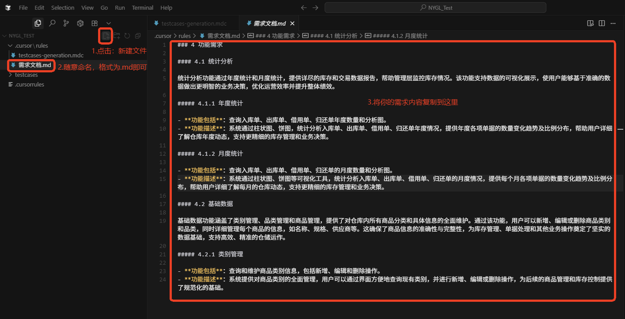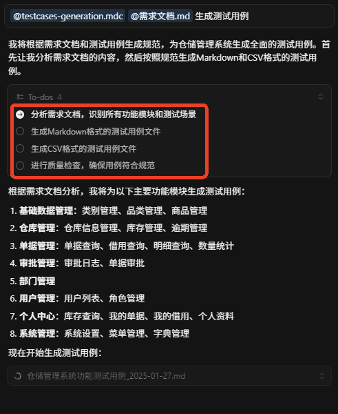 在AI对话框这里,我们能够看到Cursor会逐步来帮我们生成测试用例,先分析识别需求文档,继而生成测试用例,最后会进行质量检查,确保生成的用例符合规范。