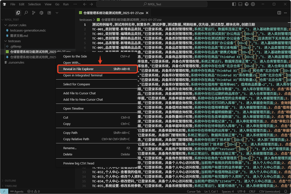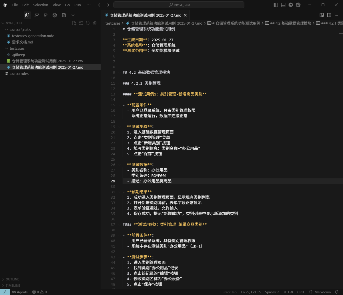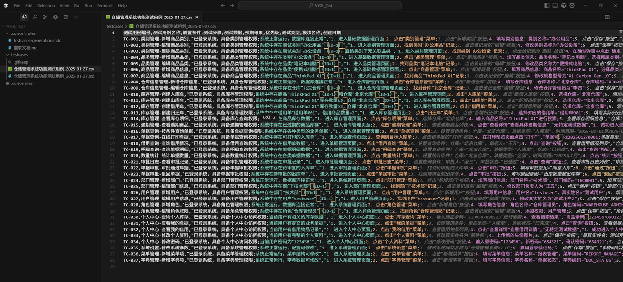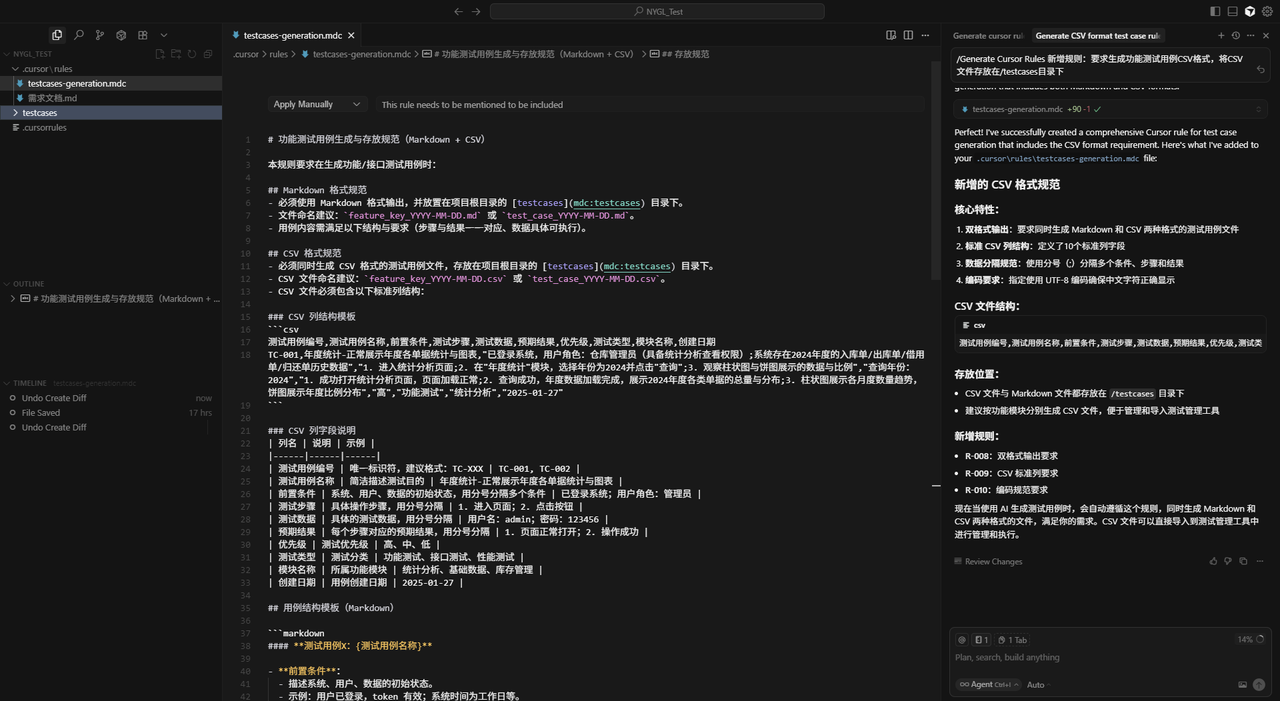 Cursor根据我的测试用例规则生成了Markdown格式和CSV格式的用例