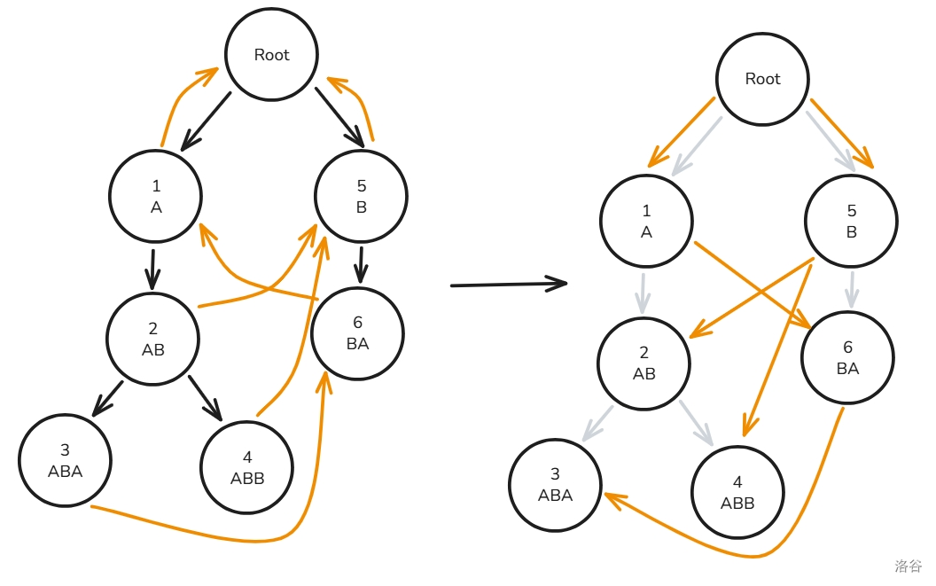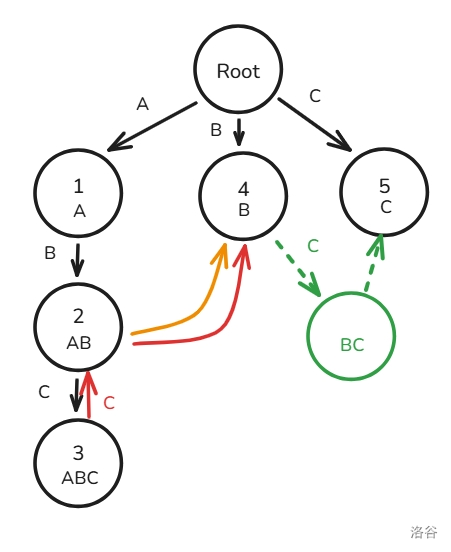 但是,如果一直暴力跳 f a i l fail fail,复杂度最坏是 O ( n ) O(n) O(n) 的,我们如何才能优化呢?我们可以建若干个虚拟节点,而这个节点指向它的 f a i l fail fail。