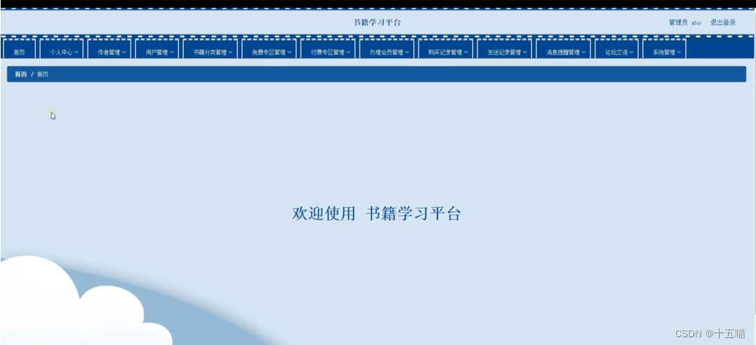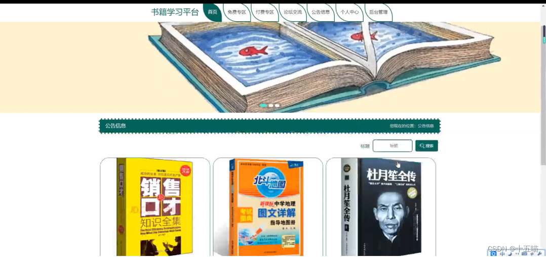 书籍学习平台,在平台首页可以查看首页、免费专区、付费专区、论坛交流、公告信息、个人中心、后台管理等内容,并进行详细操作,如图5-1所示。