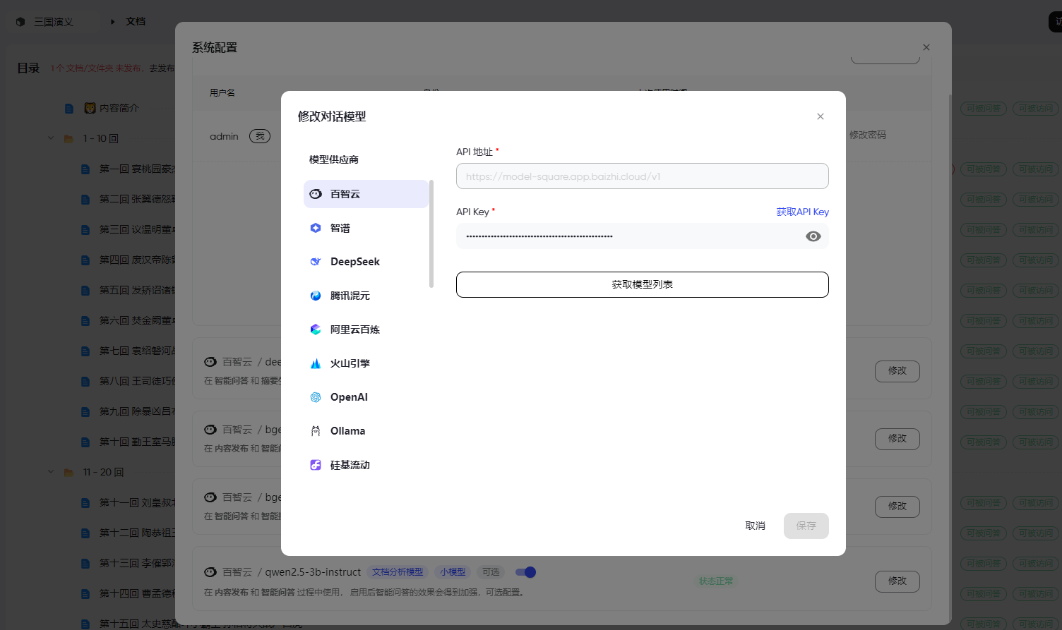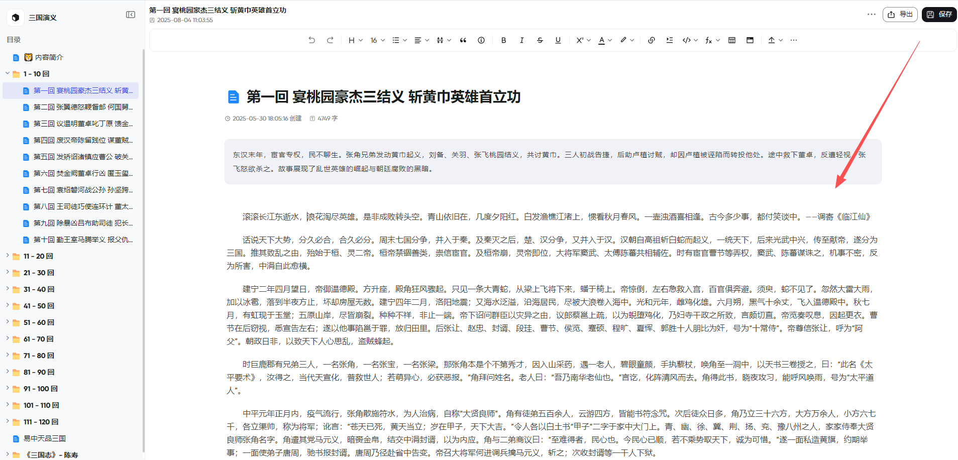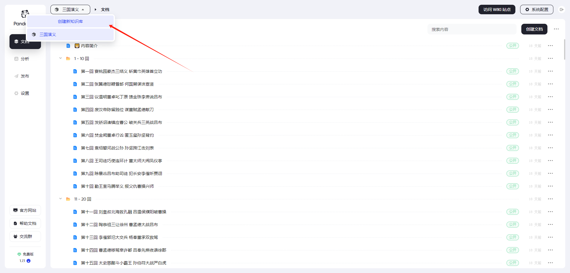 上面我们创建好了三国演义的知识库,接下来我们为知识库创建并完善对应的文档:
