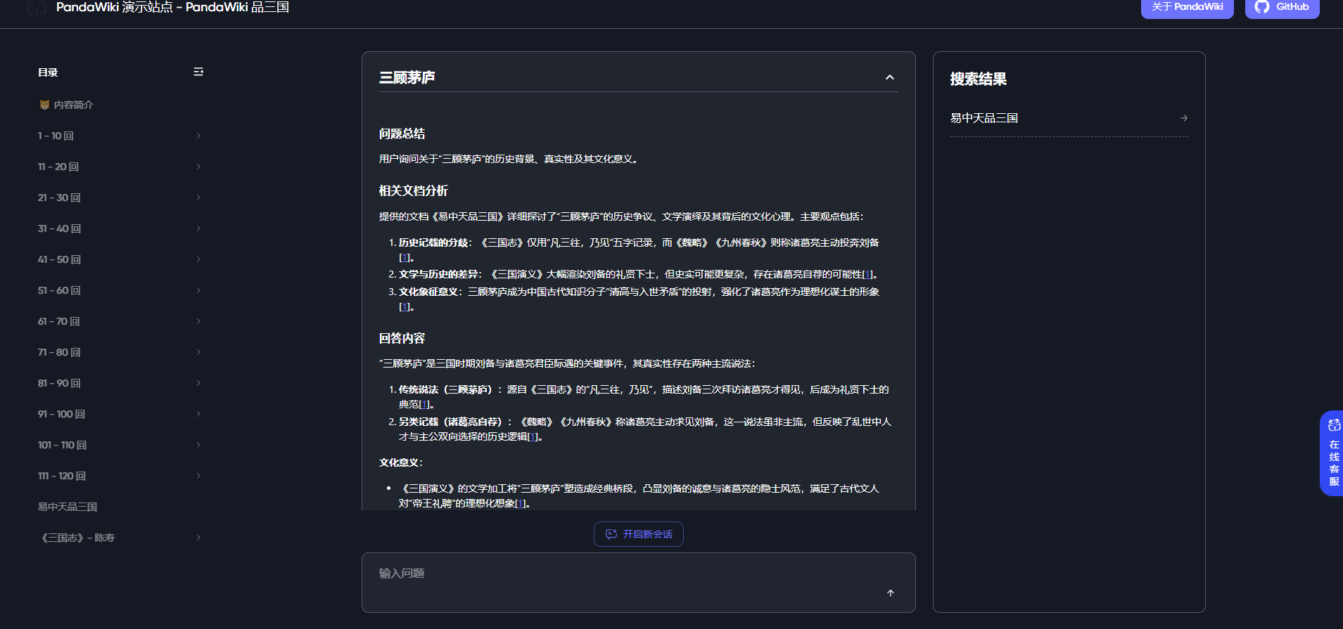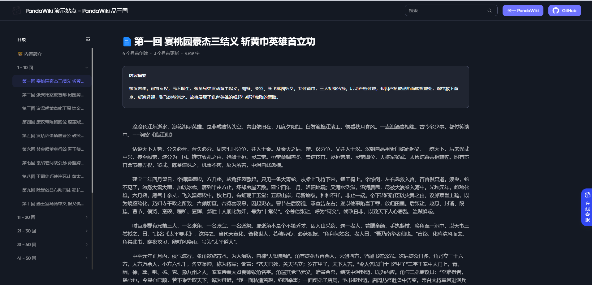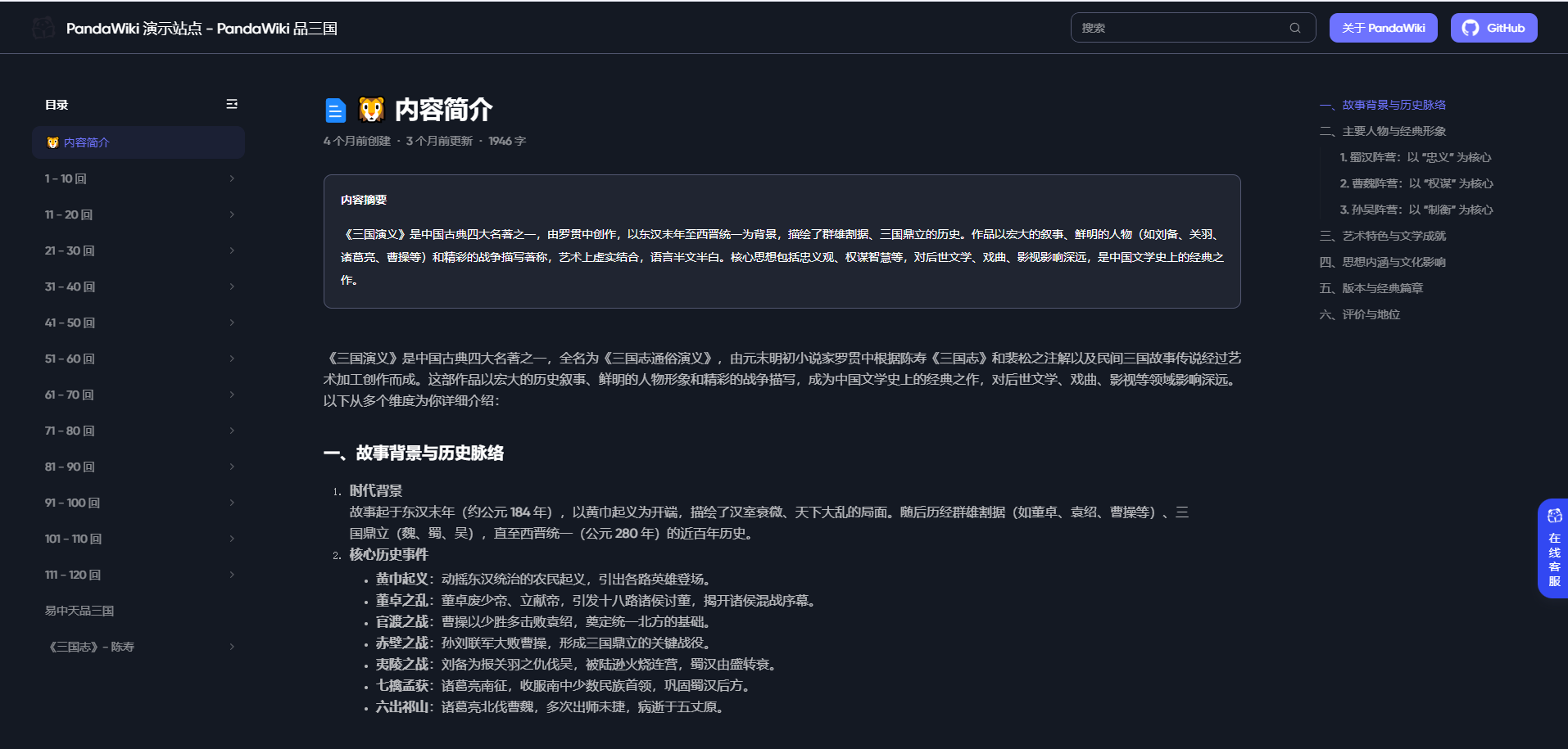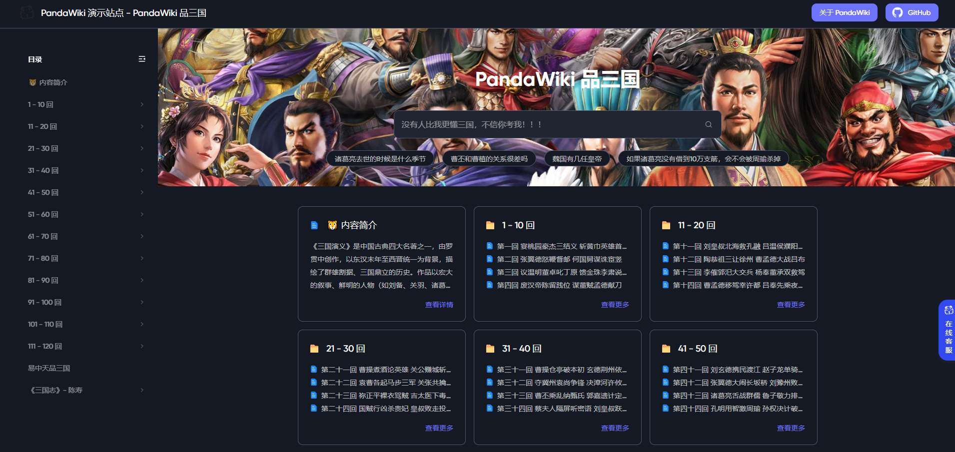接下来我们一起来看看使用 PandaWiki 快速构建的三国演义知识库: