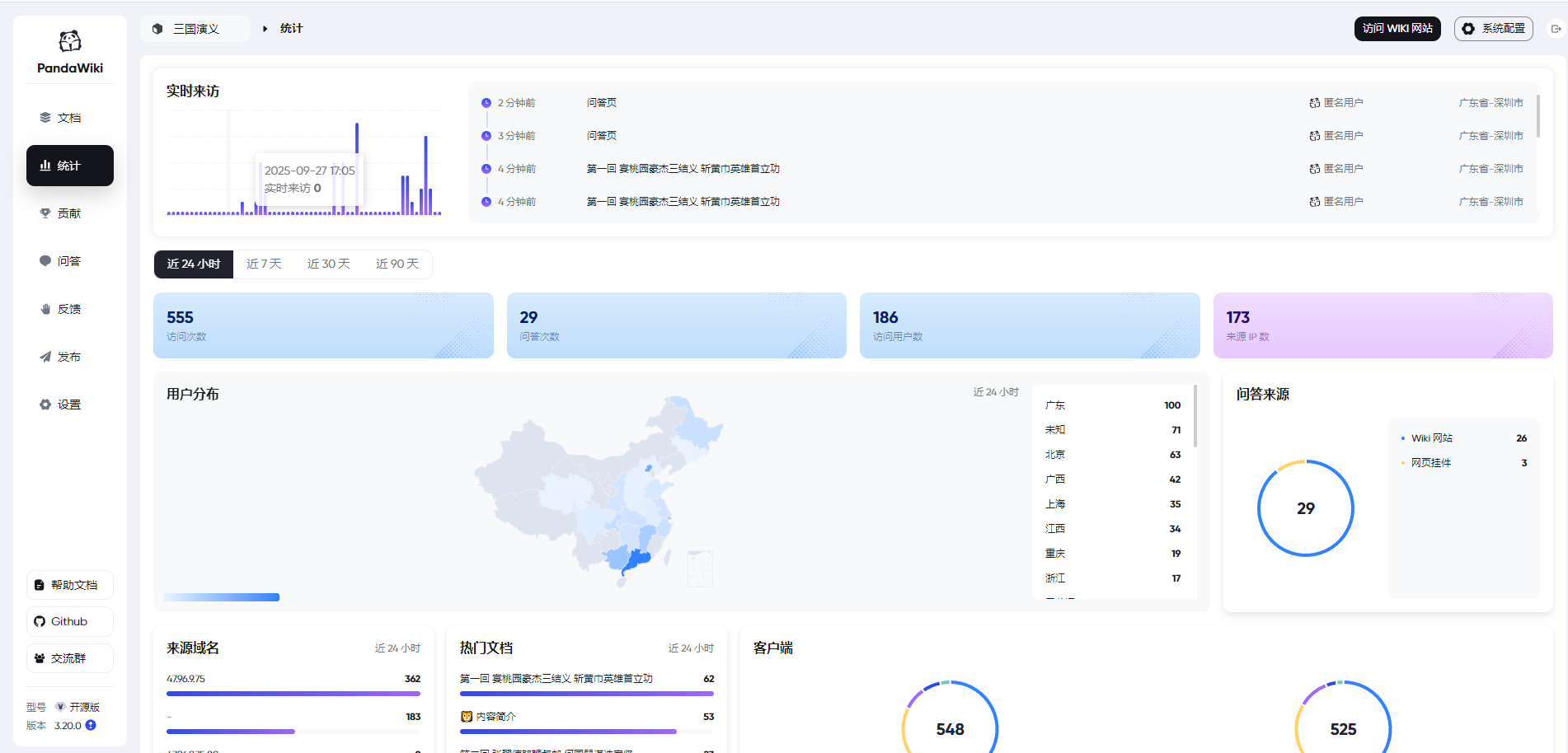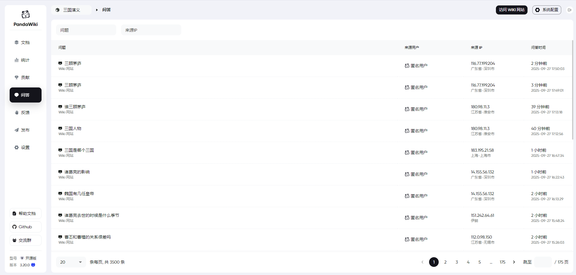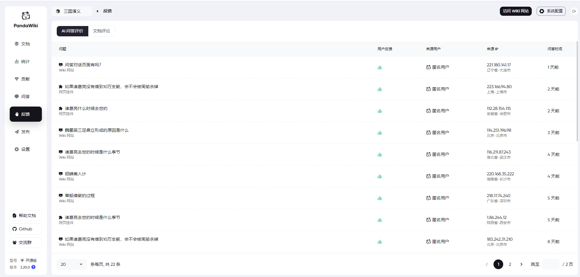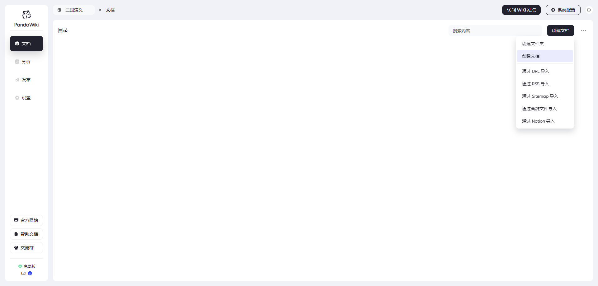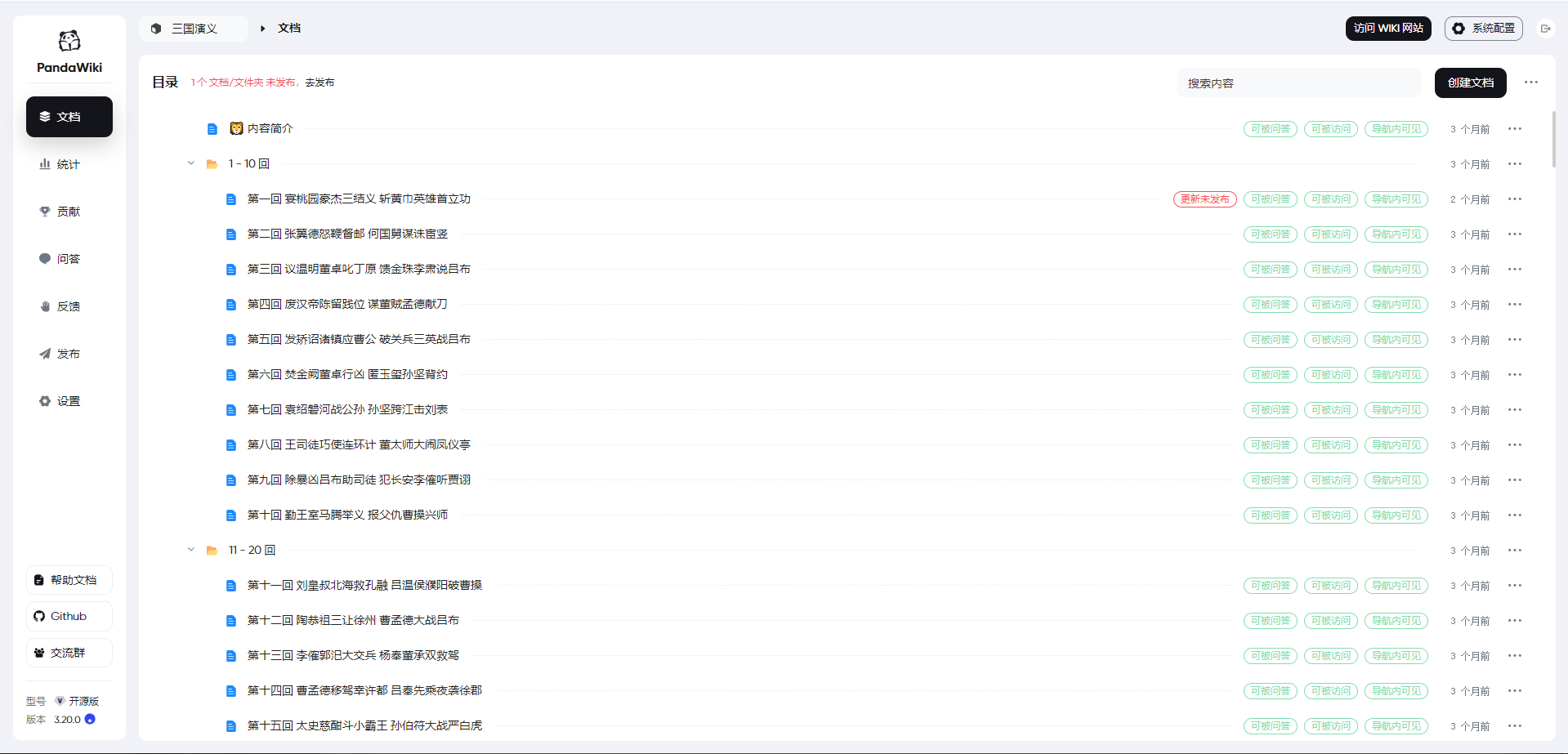 接下来我们一起来看看使用 PandaWiki 快速构建的三国演义知识库: