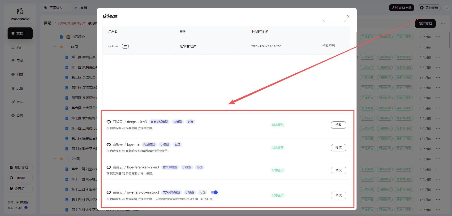 PandaWiki 安装成功后,初次进入后台管理端,我们需要配置系统配置中设置 AI 大模型: