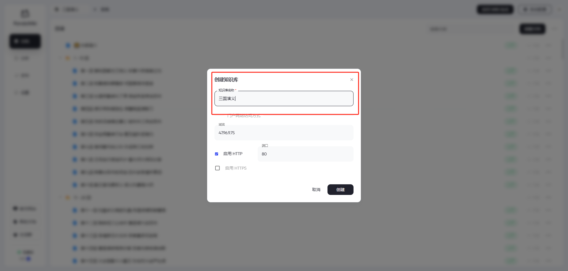 上面的配置都完成后,接下来我们先创建一个名为:三国演义的知识库。