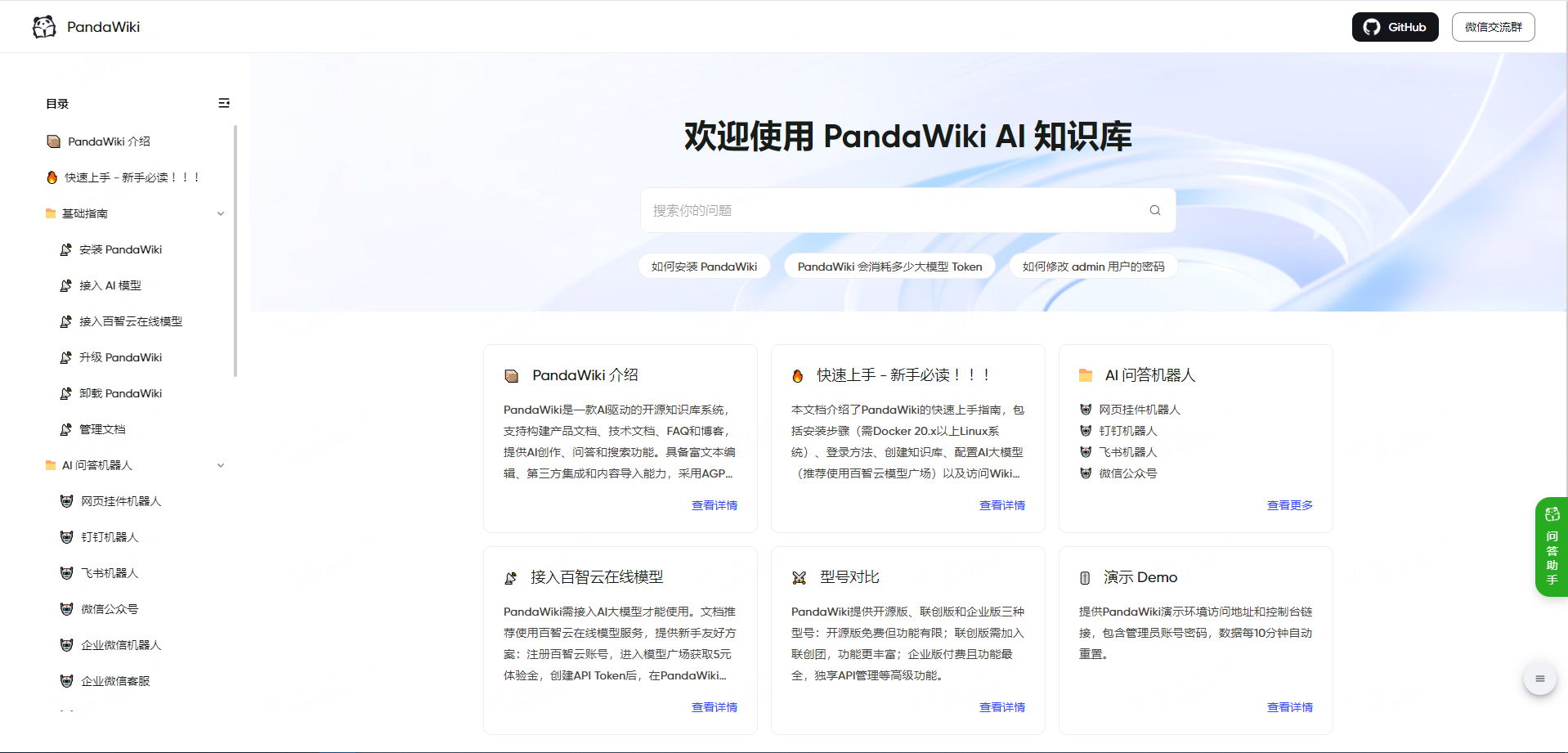 在知识呈爆炸式增长的当下,如何高效地对知识进行管理、利用与分享,已成为个人和组织亟待解决的难题。PandaWiki 作为一款基于 AI 大模型驱动的开源知识库搭建系统,凭借其支持 AI 创作、问答、搜索等强大能力,为用户提供智能化、高效化的知识管理方案,助力开启知识管理全新篇章。