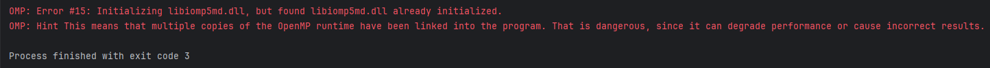 OMP: Hint This means that multiple copies of the OpenMP runtime have been linked into the program. That is dangerous, since it can degrade performance or cause incorrect results. The best thing to do is to ensure that only a single OpenMP runtime is linked into the process, e.g. by avoiding static linking of the OpenMP runtime in any library. As an unsafe, unsupported, undocumented workaround you can set the environment variable KMP_DUPLICATE_LIB_OK=TRUE to allow the program to continue to execute, but that may cause crashes or silently produce incorrect results. For more information, please see http://www.intel.com/software/products/support/.