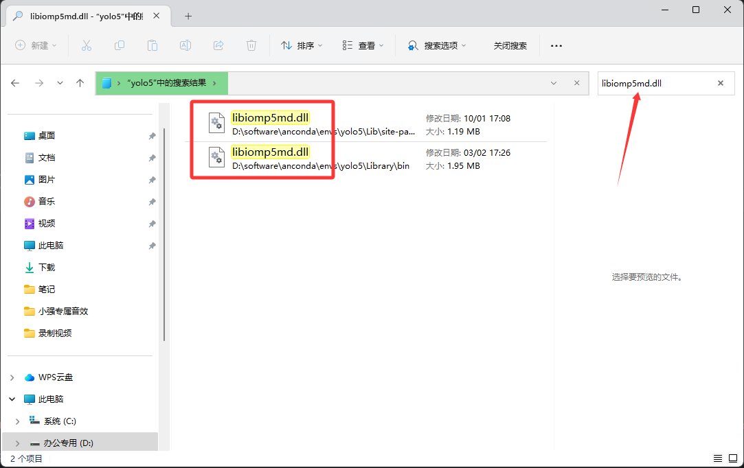 搜索完毕后,会发现有两个libiomp5md.dll,这也就是报错的原因了,因为冲突了。