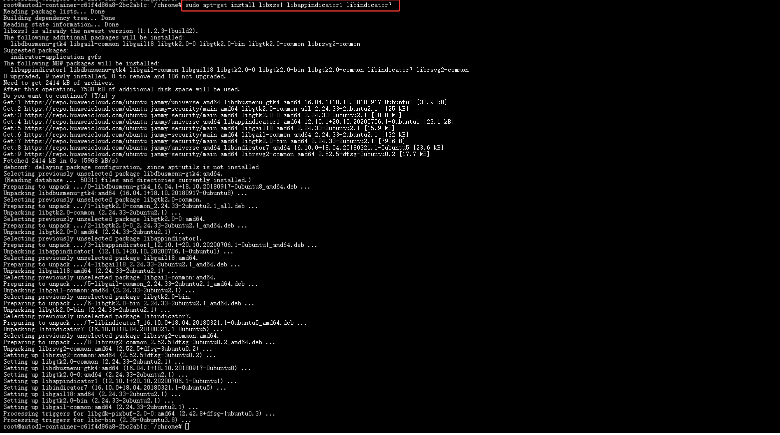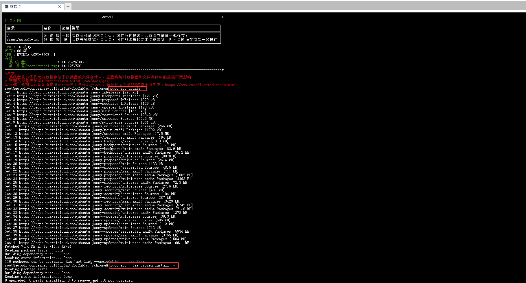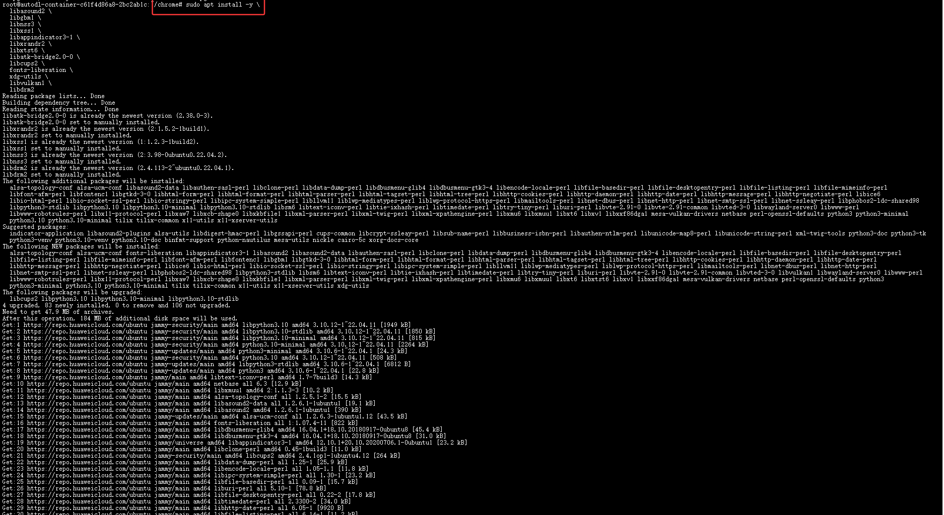 (2)打开终端后,按照以下步骤执行命令。执行这些操作的原因是当前服务器缺少 Chrome 浏览器运行所需的一些依赖包(如 fonts-liberation、libasound2、libgbm1、libvulkan1、xdg-utils),且这些依赖包在当前 APT 源中无法直接获取。