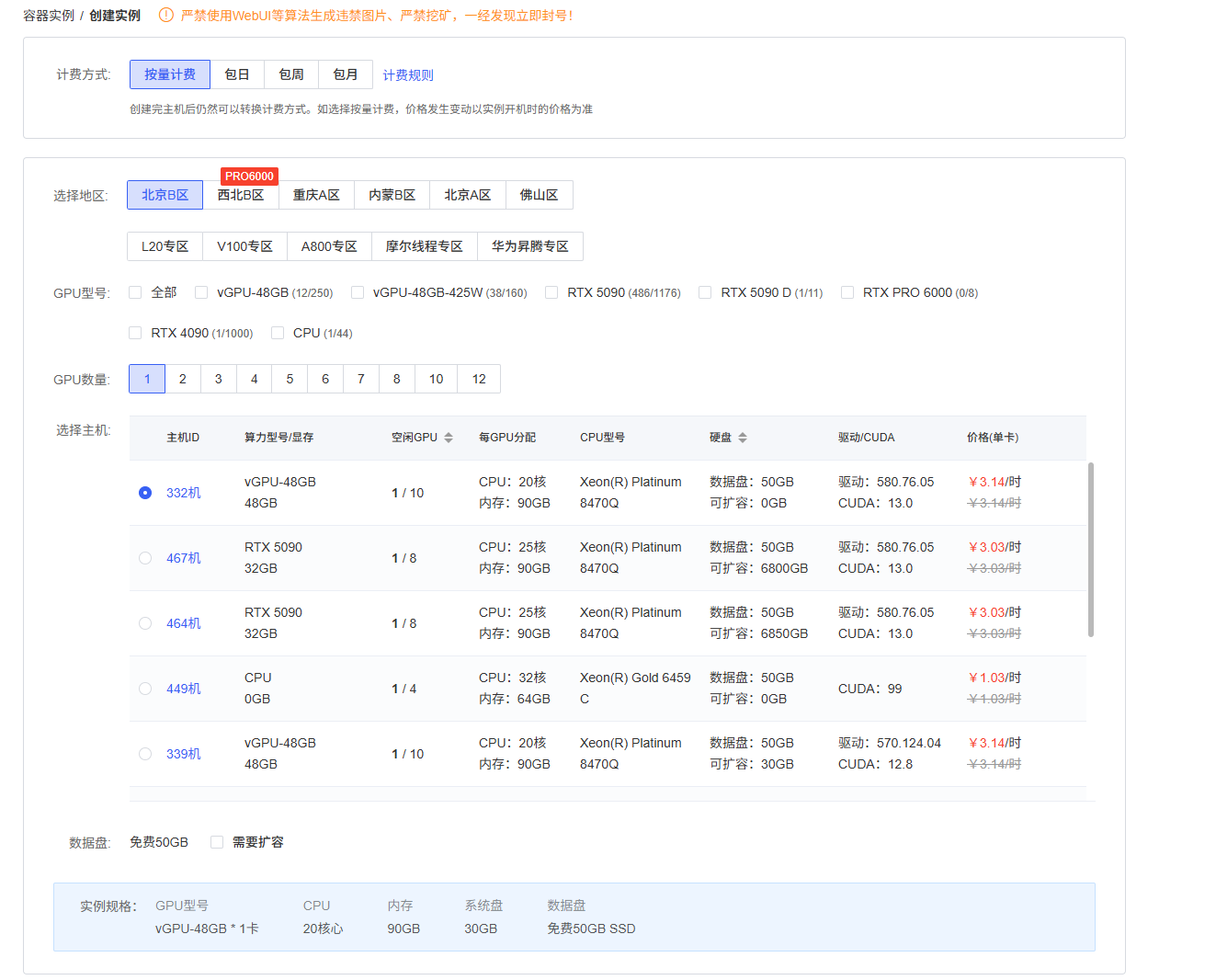(2)进入租用实例界面后,可根据自身需求选择合适的实例类型。