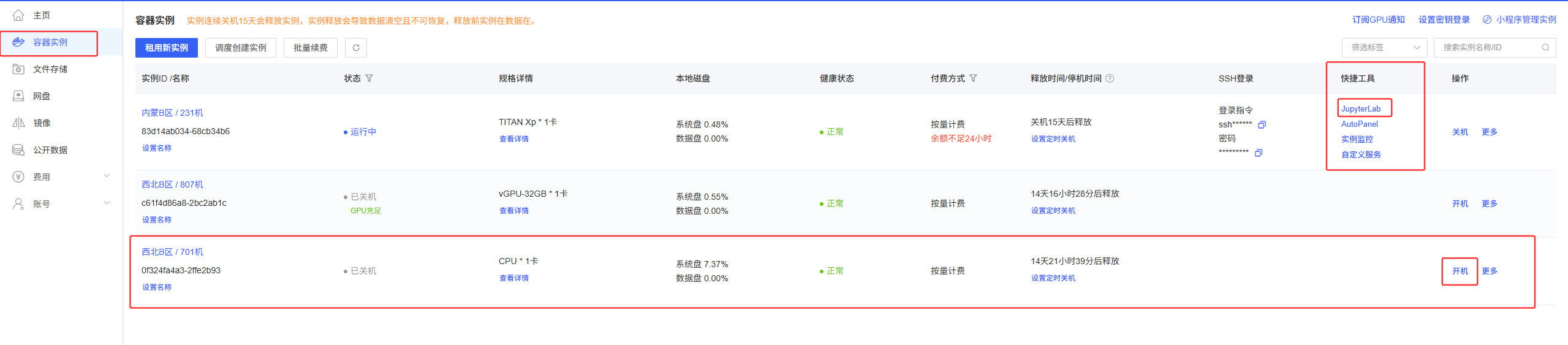 租用实例后,可以在容器实例中查看该实例的详细信息。此时即可启动实例,启动后在快捷工具栏中点击 JupyterLab 进入 Jupyter Notebook 环境。