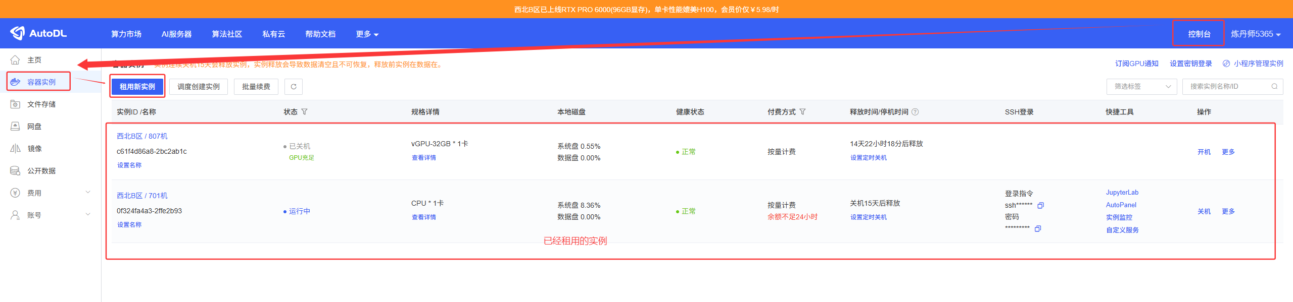 (1)注册完成后,进入控制台并点击 容器实例,即可查看已租用的实例。若为首次使用,则需要点击 租用新实例 来创建实例。