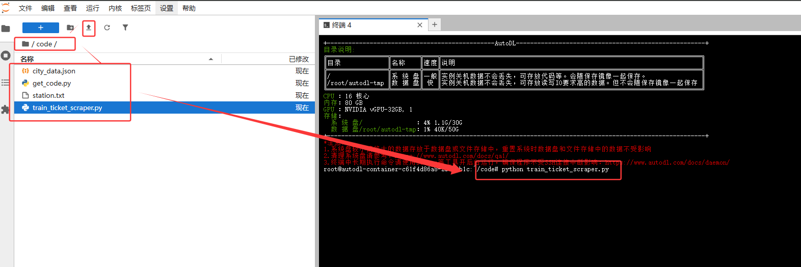 在完成第二步并成功显示版本号后,即可开始执行脚本程序。此处我选择上传本地的 Python 脚本文件。上传完成后,打开终端,输入以下命令即可运行脚本:python xxxx.py。