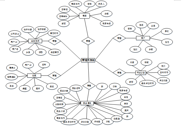 通过由实体线以及关联构成的图,E-R图能够明确地叙述系统中涵盖的实体线相互关系。将“用户、商家、菜品信息、论坛交流、网站公告、收藏”等作为实体,它们的局部E-R图,如图4-2所示:就是概念模型是对现实中的问题出现的事物的进行描述,ER图