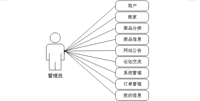 管理员登录系统所涉及到的功能主要有用户、商家、菜品分类、菜品信息、网站公告、论坛交流、系统管理、订单管理、我的信息等功能。管理员用例如图3-1所示。