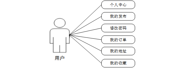 用户注册登录系统前台,点击个人中心可以对个人中心、修改密码、我的发布、我的订单、我的地址、我的收藏等功能。用户用例如图3-3所示。