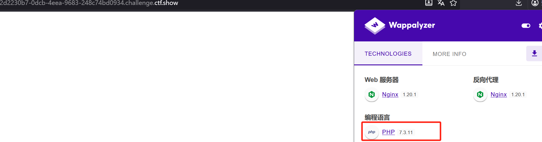 不知道你会不会想问,怎么知道这个是index.php文件呢,可以利用wappalyzer这个插件查看生产环境,发现是php,那就是php文件。