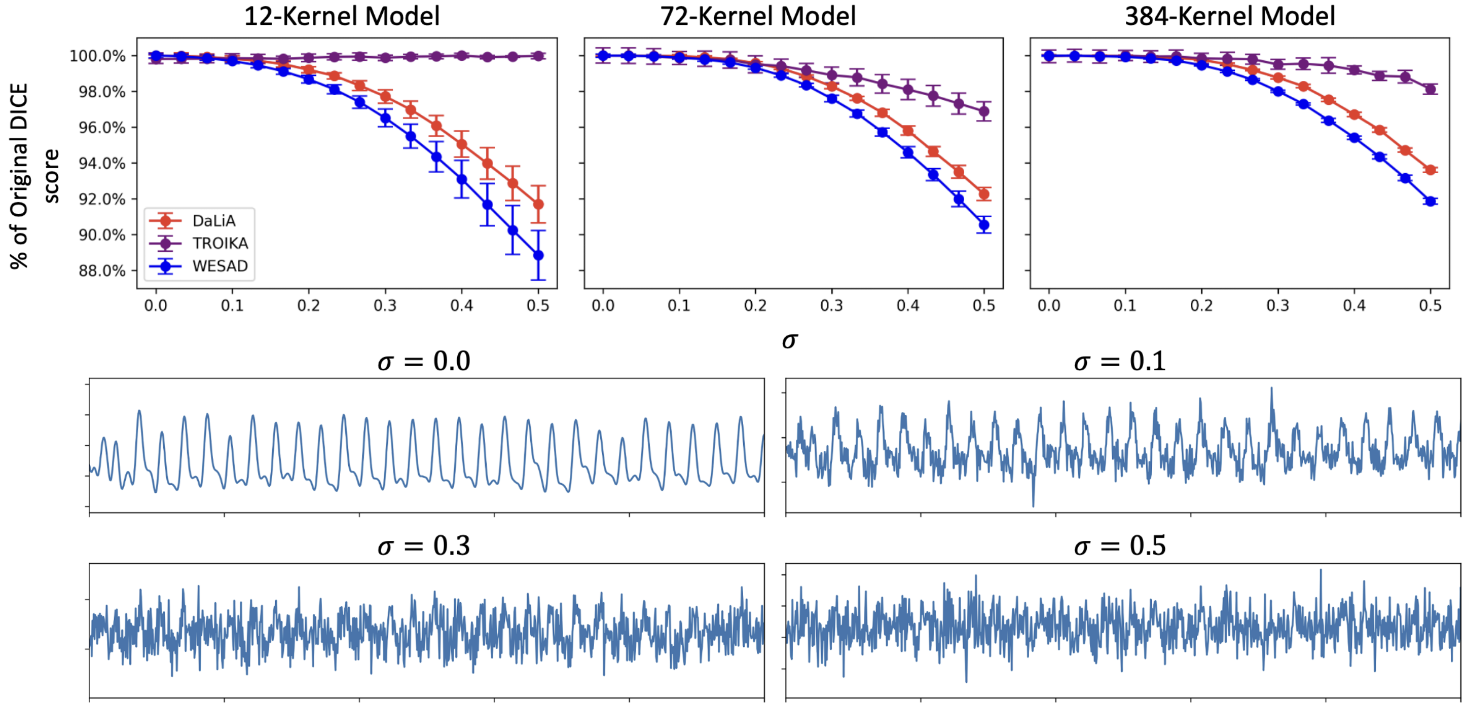 Figure 9:The performance of the learned kernel model as compared to baseline performance on the clean test signal (above panels). Examples of a PPG signals with various amounts of Gaussian noise added (bottom panels).