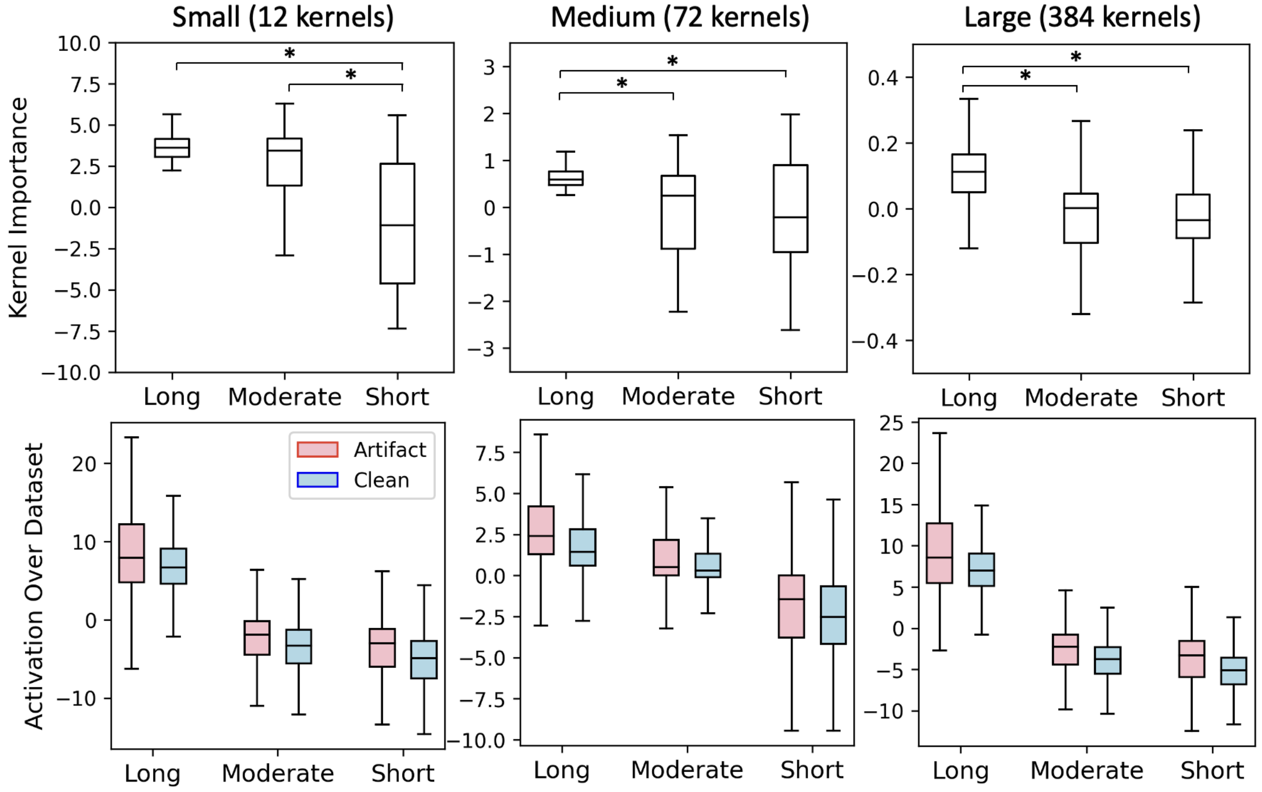 本文注意到卷积核大小与其重要性之间存在明显的规律。研究发现,对于中型和大型模型,长核的平均重要性显著高于短核和中长核(p < 10⁻¹³,显著性通过双尾独立样本 t 检验计算)。对于小型模型,长核和中长核的平均重要性显著高于短核(p < 10⁻⁶)(参见图3)。这些结果表明,长核通常学会识别低质量的信号特征,而中长核和短核则学会识别干净的 PPG 特征。