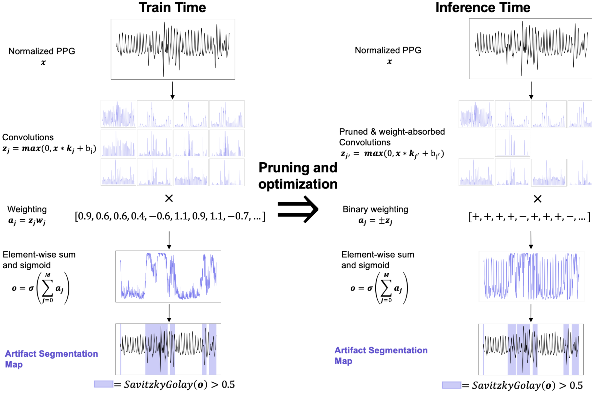 图1:PPG处理流程。展示了在训练和推理阶段用于PPG信号质量分割任务的处理流程。第一,对PPG信号进行归一化处理,利用减去均值并除以标准差,使其符合标准正态分布。接着,应用一组卷积核进行卷积运算。本文的最小模型足够轻量,使得所有的卷积后信号都能在此图中显示。卷积后的信号经过上限处理(将负值置零)、加权 和求和 ,然后应用 Sigmoid 函数进行变换。最后,对输出进行平滑和阈值处理,以完成对信号的分割。训练完成后,会利用剪枝相似的核并吸收核权重来减少参数数量。