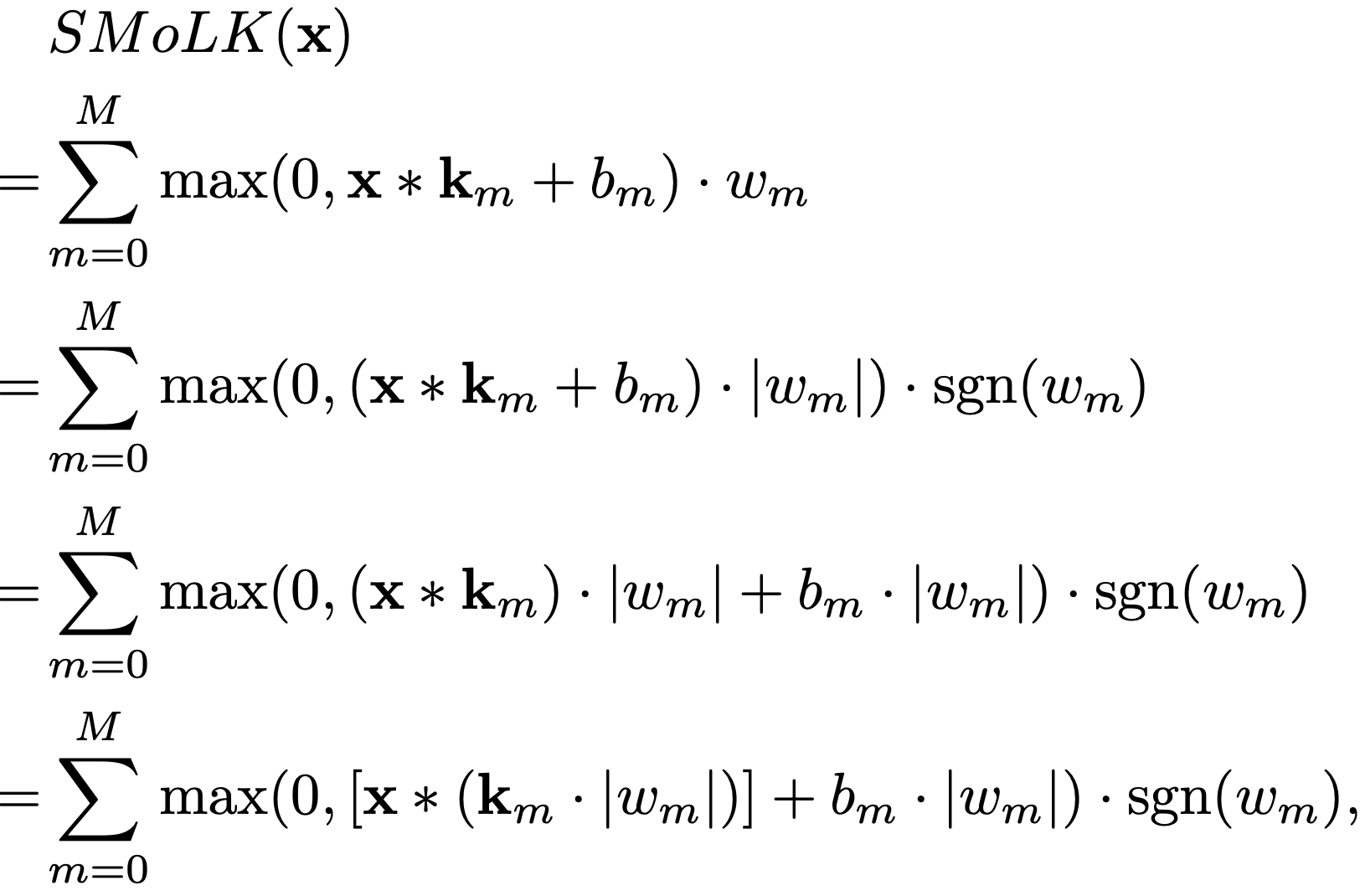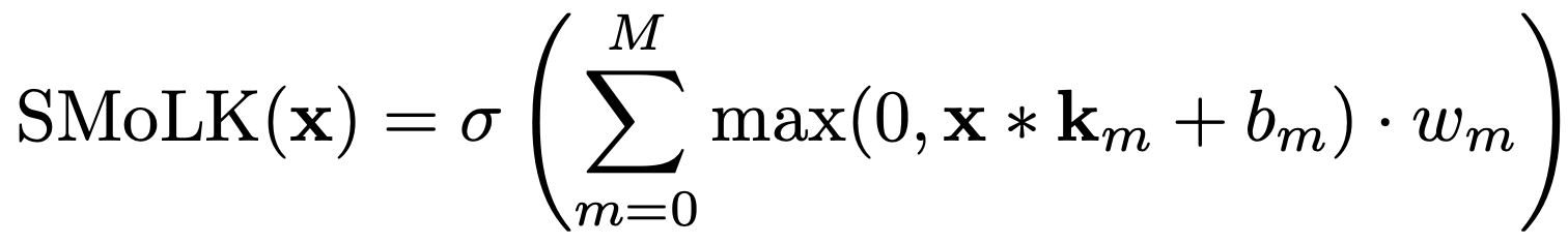 更形式化地说,该模型由M 个核、M 个标量偏置和 M 个标量权重组成。给定输入信号x,本文的 SMoLK 模型定义如下: