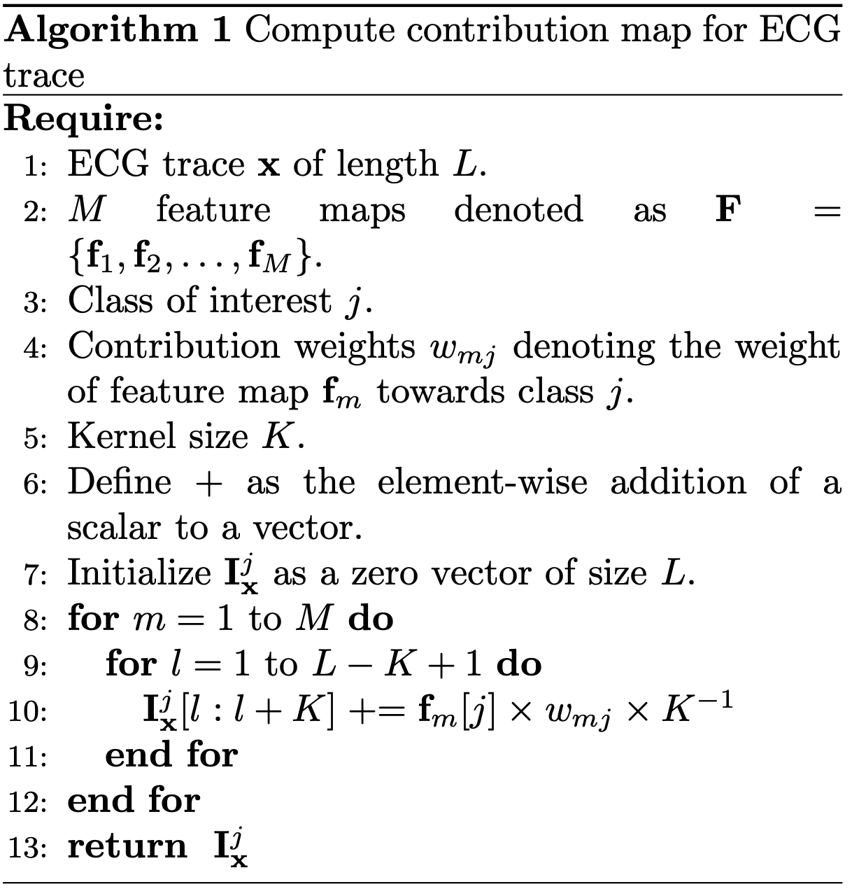 算法1 的概要描述:该算法通过利用前向传播中计算得到的特征图和线性分类层的权重w_{mj},执行一个反向传播过程。具体步骤包括初始化一个与输入信号等长的零向量作为贡献图,然后对于每个特征核m 和每个类别 j,将特征图 与对应的权重w_{mj}相乘,再通过转置卷积核_m将加权后的特征图"映射回"输入信号空间,并将其累加到贡献图中。最终得到的贡献图清晰地表现了输入信号中每个时间点对最终分类决策的重要性程度。